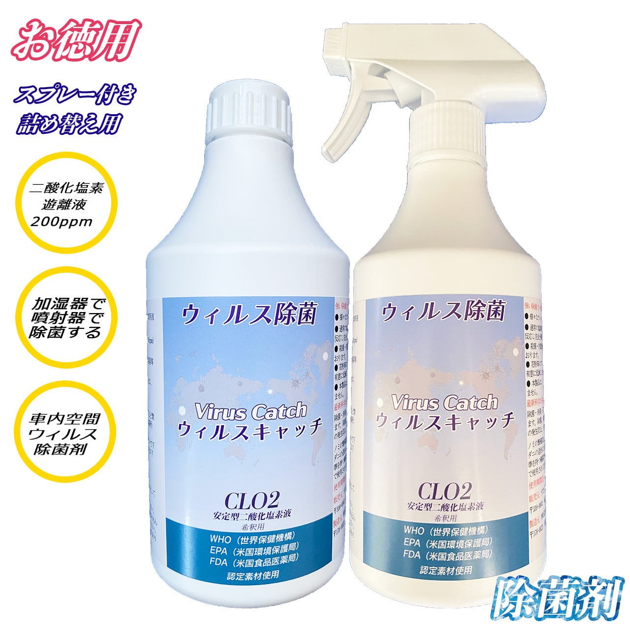 ウィルスキャッチ・二酸化塩素遊離液200ppm【500ml×2本】スプレー&詰め替えタイプ