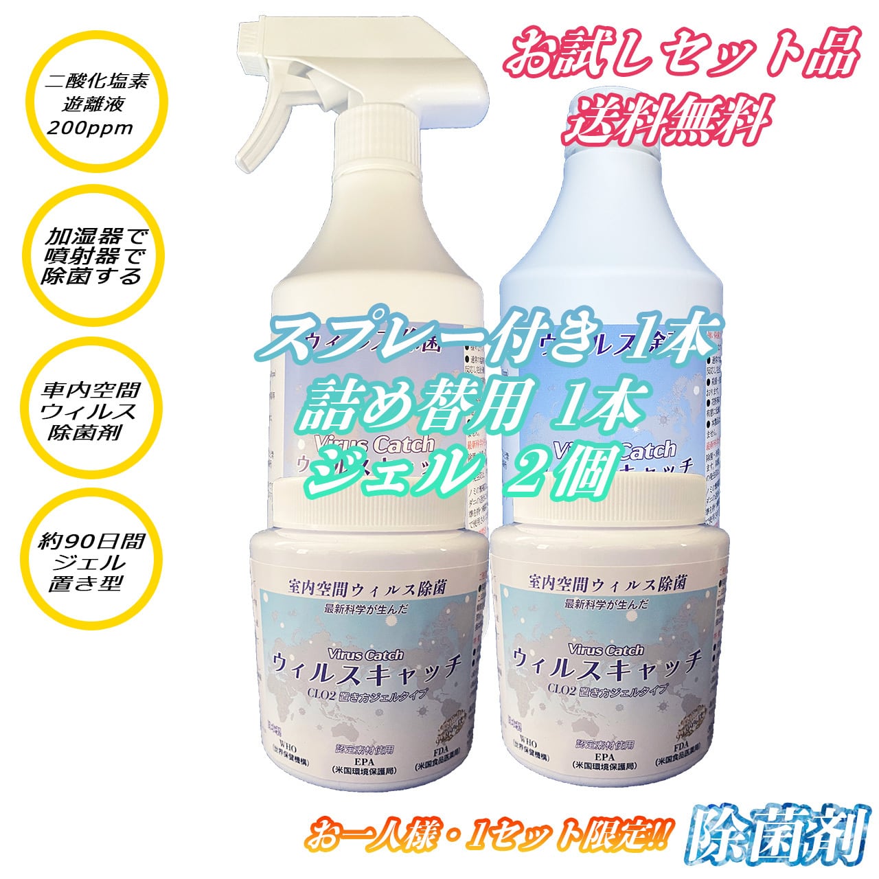 商品内容・お試しセット品・送料無料 / ウィルスキャッチ・二酸化塩素遊離液200ppm【500ml×2本】スプレー&詰め替え プラス 置き型ジェルタイプ 2個